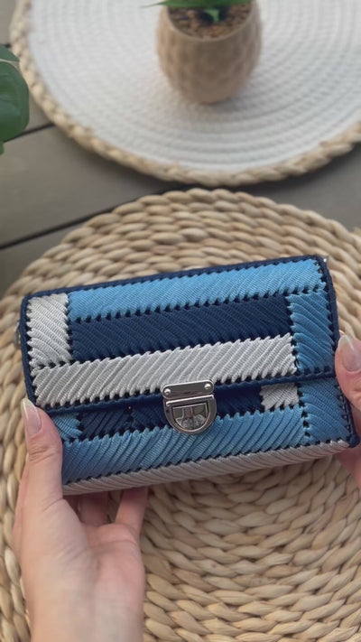 Realizzata a mano con tre tonalitĂ di fettuccia di alta qualitĂ , intrecciate con una trama studiata per esaltare ogni colore da qualsiasi angolazione.