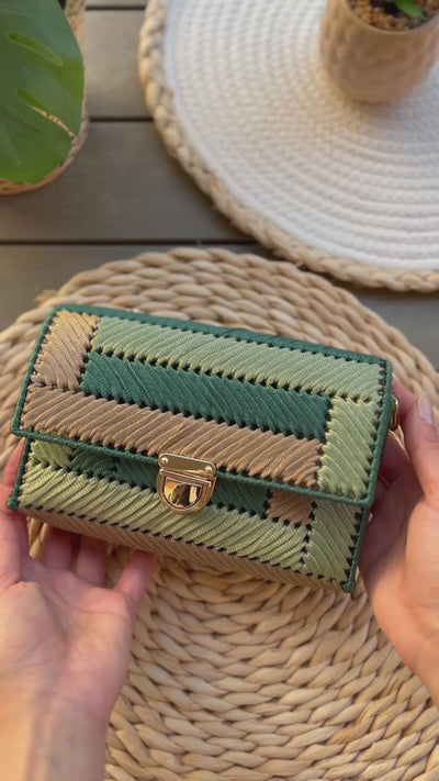 Realizzata a mano con tre tonalitĂ di fettuccia di alta qualitĂ , intrecciate con una trama studiata per esaltare ogni colore da qualsiasi angolazione.